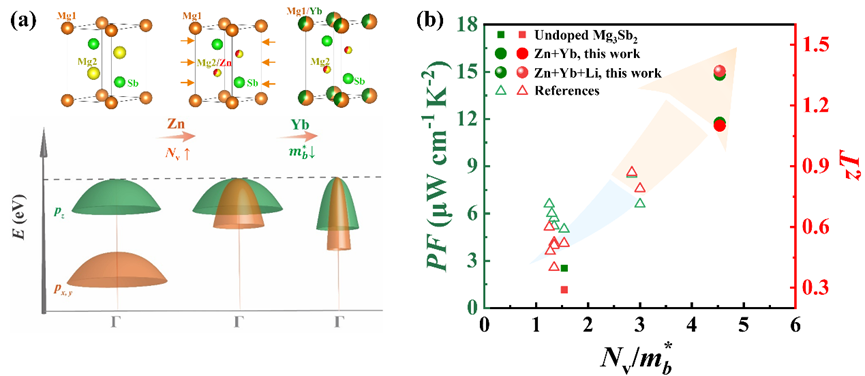 Figure 1. Band structure and TE performance of p-type Mg3Sb2-based materials. (a) Schematic diagram of the crystal structure and the valence band structure near Γ point. (b) Thermoelectric power factor PF and figure of merit zT versus Nv/ at 773 K for p-type Mg3Sb2-based materials.