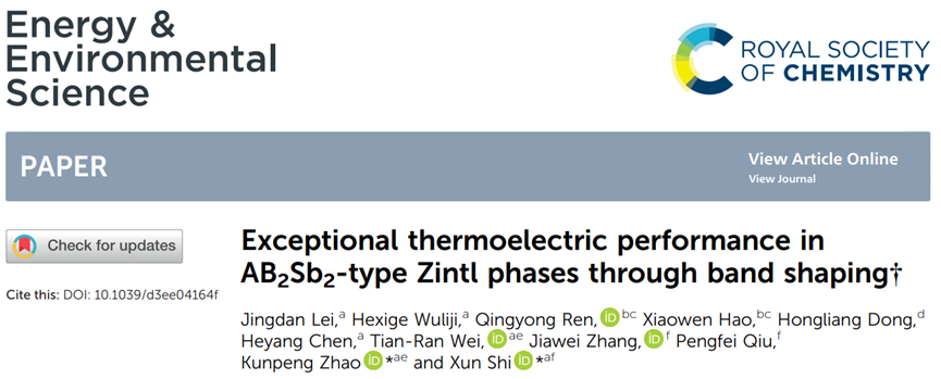 Recently, the research team from Shanghai Jiao Tong University, cooperated with the scientists from Dongguan Spallation Neutron Source Science Center and Shanghai Center for High Pressure Science and Technology Advanced Research, made important new progress in the band structure modularization and performance optimization of AB2Sb2 based thermoelectric materials. Relevant results have been published in the journal of Energy & Environmental Science entitled “Exceptional thermoelectric performance in AB2Sb2-type Zintl phases through band shaping” (DOI: 10.1039/d3ee04164f).