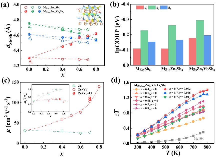 Figure 3. (a) The length of interlayer (d1) and intralayer (d2 and d3) Sb-Sb bonds as a function of x. The inset illustrates three different Sb-Sb bonding in the crystal structure. (b) Integrated projected crystal orbital Hamilton population (IpCOHP) of the three Sb–Sb bonding for pristine Mg3Sb2, Zn-doped Mg3Sb2, and Zn/Yb co-doped Mg3Sb2. (c) Room temperature carrier mobility m as a function of x for Mg3-2xZn2xSb2 (x = 0, 0.4, 0.6, 0.7), Mg3-3xZn2xYbxSb2 (x = 0.4, 0.5, 0.6, 0.7, 0.8), and Mg0.9-yLiyZn1.4Yb0.7Sb2 (y = 0.003, 0.005). The dashed lines are guide to the eyes. The inset shows the calculated DOS effective mass based on the SPB model. (d) Temperature dependent figure of merit zT.