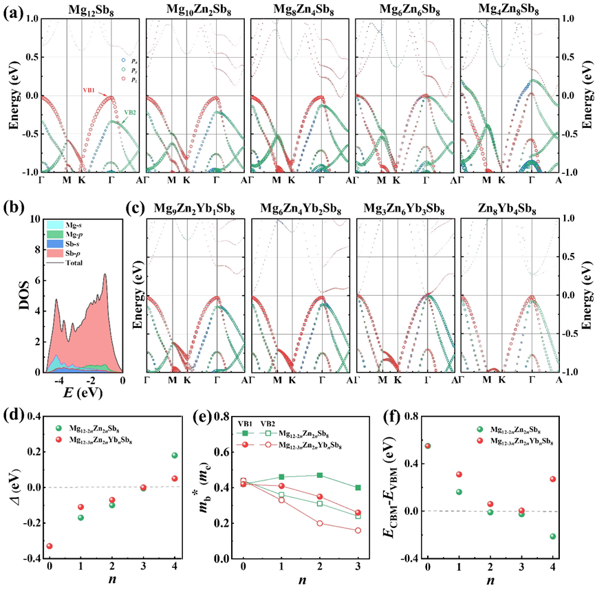 Figure 2. The band structures for (a) Mg12-2nZn2nSb8, and (c) Mg12-3nZn2nYbnSb8 (n = 0, 1, 2, 3, 4) calculated by the mBJ + SOC method. (b) Atom-projected density of states (DOS) of the valence band for Mg12Sb8. (d) Crystal field splitting energy Δ, (e) effective mass of the valance band edges (VB1 or VB2), and (f) energy difference between CBM and VBM (ECBM-EVBM) as a function of the alloying content n.