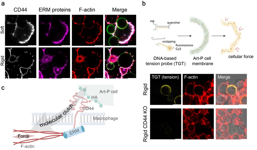 The research team further focused on the artificial cell–macrophage interaction interface. Using techniques such as immunofluorescence, inhibitor treatment, and specific gene knockout, they confirmed the existence of a "molecular clutch" structure at the interaction interface, formed by the connection between the glycocalyx component hyaluronic acid on the artificial cell membrane, the CD44 receptor on the macrophage surface, and the cytoskeletal F-actin. Mechanical measurements using DNA-based tension probes further demonstrated that increased stiffness of the artificial cells promotes the assembly of this clutch and the transmission of intracellular forces (Figure 3).