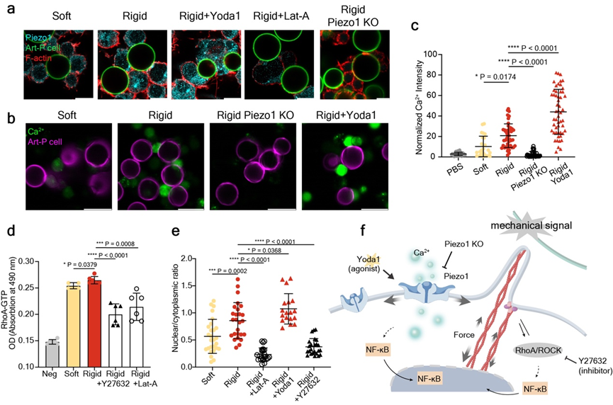As cell polarization is ultimately regulated at the level of gene expression, a biochemical process, the team further investigated the mechano-biochemical signal transduction occurring within macrophages. The results indicated that the macrophage membrane mechanosensitive ion channel Piezo1 and the RhoA/ROCK signaling pathway play key roles in this mechano-biochemical signal transduction, jointly regulating the expression of pro-inflammatory-related genes (Figure 4).