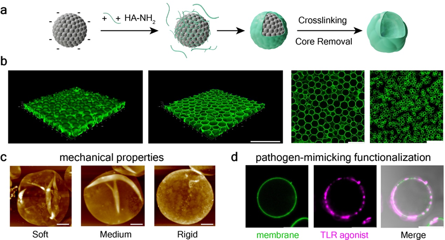 The research team first established a novel all-aqueous phase system for constructing cell-like materials, enabling the batch production of compartmentalized, cell-like materials with homogeneous properties and flexibly tunable parameters. Through functional modifications of their interior and surface, they successfully constructed artificial cells mimicking pathogens with a series of stiffness gradients within the physiologically relevant stiffness range (Figure 1).