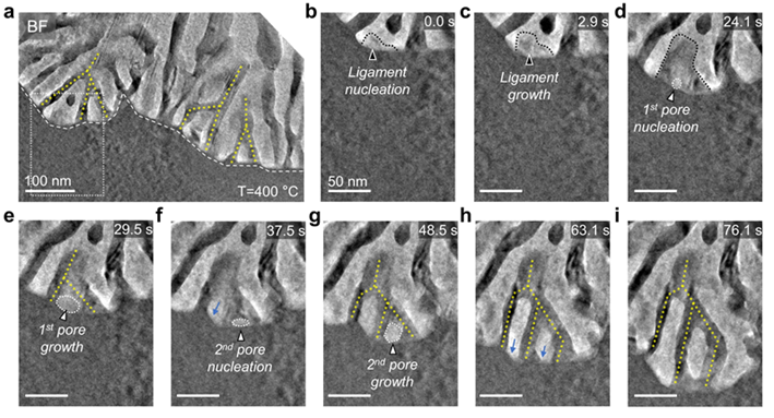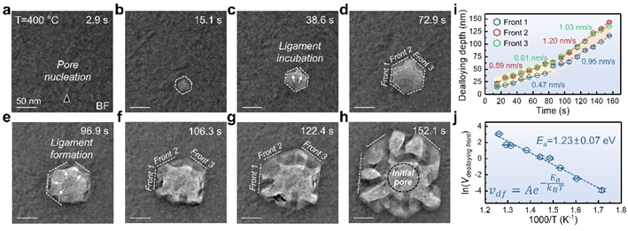 Nanoporous metals, with their high specific surface area and continuous pore structure, demonstrate broad applications such as catalysis, energy, and sensing. These materials are typically prepared via the dealloying method, wherein specific components are selectively removed from alloys, causing the remaining components to spontaneously reorganize into a three-dimensional nanoporous structure. However, direct experimental evidence supporting the mechanisms of pore formation and evolution during dealloying—particularly at the nanoscale or atomic level—has long been lacking. Existing theories are largely based on ex-situ characterization and computational simulations, necessitating validation through in situ experimental techniques with high spatiotemporal resolution to deepen our understanding of dealloying mechanisms.