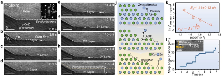 To address these challenges, the research team leveraged the inherent high-vacuum environment and in situ heating technique of transmission electron microscopy (TEM). They successfully activated the vapor phase dealloying (VPD) process of a γ-CoZn alloy precursor within the TEM chamber and performed in situ observations. The experiments comprehensively revealed the entire process from initial pore nucleation and evolution to the final formation of a three-dimensional nanoporous structure. Further investigations revealed that the dealloying front propagates layer-by-layer into the precursor. This process occurs through pit nucleation on the crystal planes, forming the dealloying fronts, and subsequent step flow. Statistical analysis of dealloying rates and step flow rates at different temperatures indicates that zinc sublimation at the dealloying front, rather than surface diffusion of residual cobalt atoms, is the rate-limiting step in VPD. The activation energy for dealloying, exceeding that of pure zinc sublimation, indicates that the strong bonding energy of Co-Zn bonds within the alloy precursor significantly influences dealloying kinetics. This finding corrects the limitation of classical dealloying theory, which solely relies on coordination number as a criterion for dissolution.
