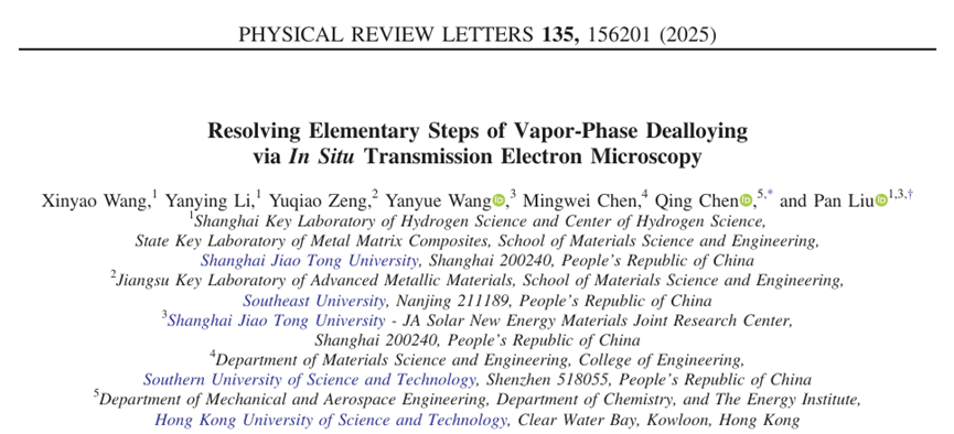 Recently, the research team of Prof. Liu at the Shanghai Key Laboratory of Hydrogen Science and the Center of Hydrogen Science has made significant progress in studying the mechanism of vapor-phase dealloying. The findings were published in the internationally renowned academic journal Physical Review Letters under the title “Resolving Elementary Steps of Vapor-Phase Dealloying via In Situ Transmission Electron Microscopy.”