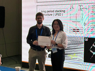 Doctoral candidates Jiacheng Wang, Chenyang Ding, Jing Luo, Yanlin Tong, and Ziyan Li from the Light Alloy Center delivered excellent oral presentations on their respective research topics: the corrosion resistance of die-cast AE44 Mg-RE alloy; the fracture toughness of extruded Mg-Gd-Y-Zn-Mn alloy; the microstructural evolution of laser-melted Al-Mg-Si alloy; Orowan strengthening by precipitates in magnesium alloys; and the microstructural evolution behavior during additive friction stir manufacturing of Mg-Gd-Y alloy. Their presentations demonstrated the innovative vitality and solid academic foundation of the student team.