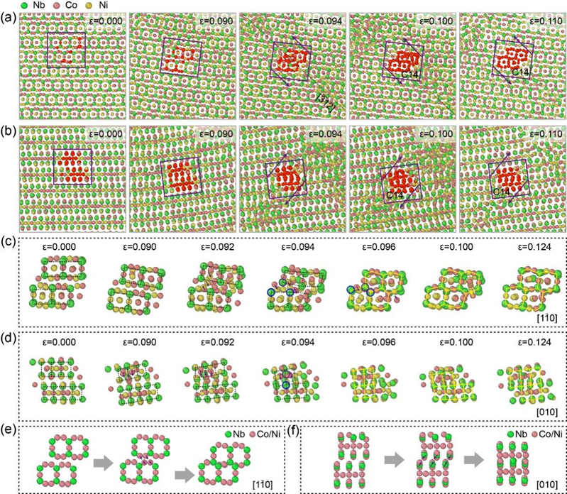and [010] directions, respectively. (e) and (f) The schematic illustrations of the atomic movement during the M to C14 phase transitions viewed along the
