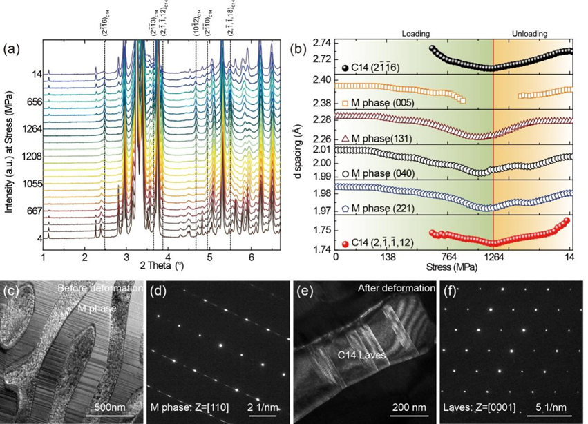 Figure 3. (a) In-situ high-energy X-ray diffraction patterns captured from the as-cast CoNiNb0.37 eutectic alloys under varying stress levels. (b) Variation of d-spacing under applied stress for different lattice planes in the M phase and C14 Laves phase. (c) TEM image illustrating the eutectic alloy with a dual-phase structure of M phase and FCC prior to deformation. (d) SAED pattern corresponding to the M phase in (c). (e) Dark-field TEM images post deformation revealing the transformation of M phase to C14 Laves phase. (f) SAED pattern of C14 Laves phase in the deformed eutectic structure.