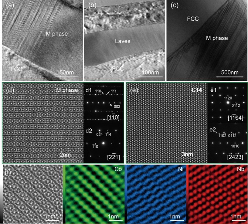 Figure 1. (a-c) The TEM images of the CoNiNb0.37 eutectic alloy at as cast, 800℃ annealed and 1200℃ annealed conditions. (d) The STEM-HADDF image and SAED patterns of the M phase in the as-cast eutectic alloy. (e) The STEM-HADDF image and SAED patterns of the C14 laves phase. (f) The elemental mapping of the M phase along the