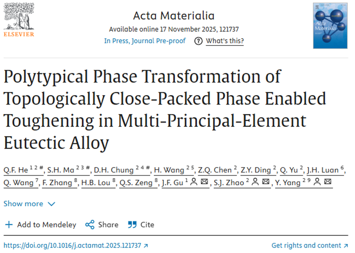 Recently, the research team of Prof. Gu Jianfeng and Prof. He Quanfeng from the School of Materials Science and Engineering at Shanghai Jiao Tong University, together with several international collaborators, have made important progress in understanding and engineering topologically close-packed (TCP) phases in high-performance structural alloys. Their work, titled “Polytypical Phase Transformation of Topologically Close-Packed Phase Enabled Toughening in Multi-Principal-Element Eutectic Alloy” has been published in Acta Materialia. This study reports a breakthrough in solving the long-standing brittleness problem of TCP phases, materials known for excellent high-temperature strength but notorious for their catastrophic fracture behavior at room temperature. The team demonstrates that a specially designed metastable multi-principal-element TCP phase (the M phase) can undergo a reversible, shear-activated polytypic transformation into a C14 Laves phase under stress, enabling an unprecedented combination of high strength, ductility, and toughness in a TCP-rich alloy.