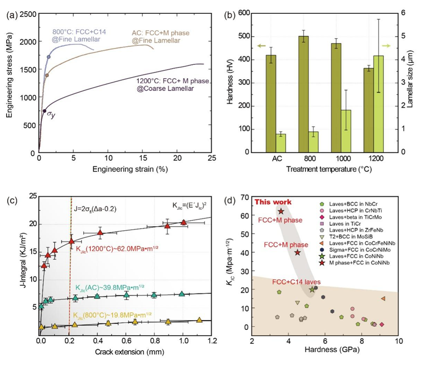 Figure 2. (a) Engineering stress-strain curves of as-cast, 800℃ annealed, and 1200℃ annealed samples. (b) Microhardness and lamellar size of samples post-annealing at varying temperatures. (c) J-R curves derived from fracture toughness tests of the as-cast, 800℃ annealed and 1200℃ annealed samples. (d) Fracture toughness KIC plotted against the hardness of the current alloy compared to other TCP phase reinforced alloys.